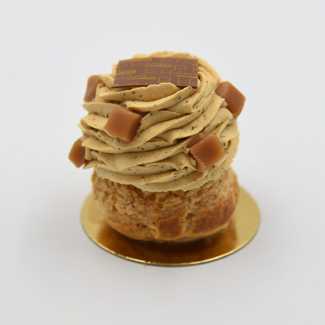 Chou craquelin, poires pochés à la vanille et chantilly au caramel beurre salé.