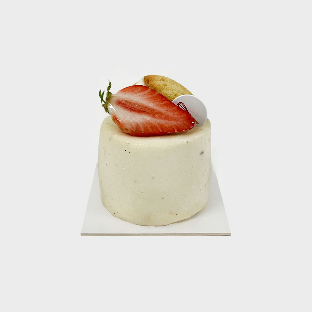 Biscuit citron, compotée de fraise des bois et de rhubarbe et d’une onctueuse mousse à la vanille.