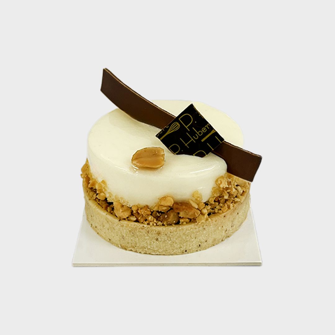 Pâte sucrée garnie d’un crémeux caramel et ses éclats de cacahuètes, nuage de bavaroise à la vanille Bourbon.
